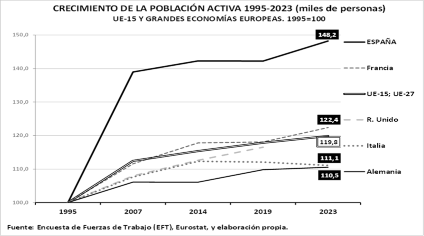Ninguno de los países europeos, ni siquiera los más grandes, ha conocido un crecimiento tan considerable de la población activa. Desde mediados de los años noventa, periodo de prácticamente treinta años para el que las estadísticas europeas (Eurostat) permiten fácilmente obtener datos, ese crecimiento ha más que duplicado al de los otros países más grandes de Europa, como se comprueba de un vistazo en el gráfico siguiente.