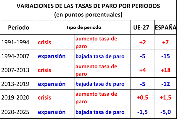 - En la crisis de comienzos de los noventa la tasa de paro aumentó en España en 7 puntos porcentuales frente a sólo 2 en el conjunto de países de la Unión Europea.